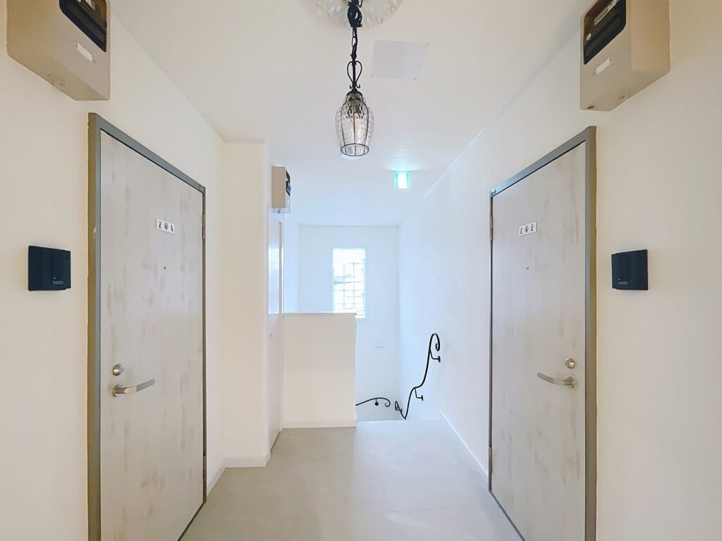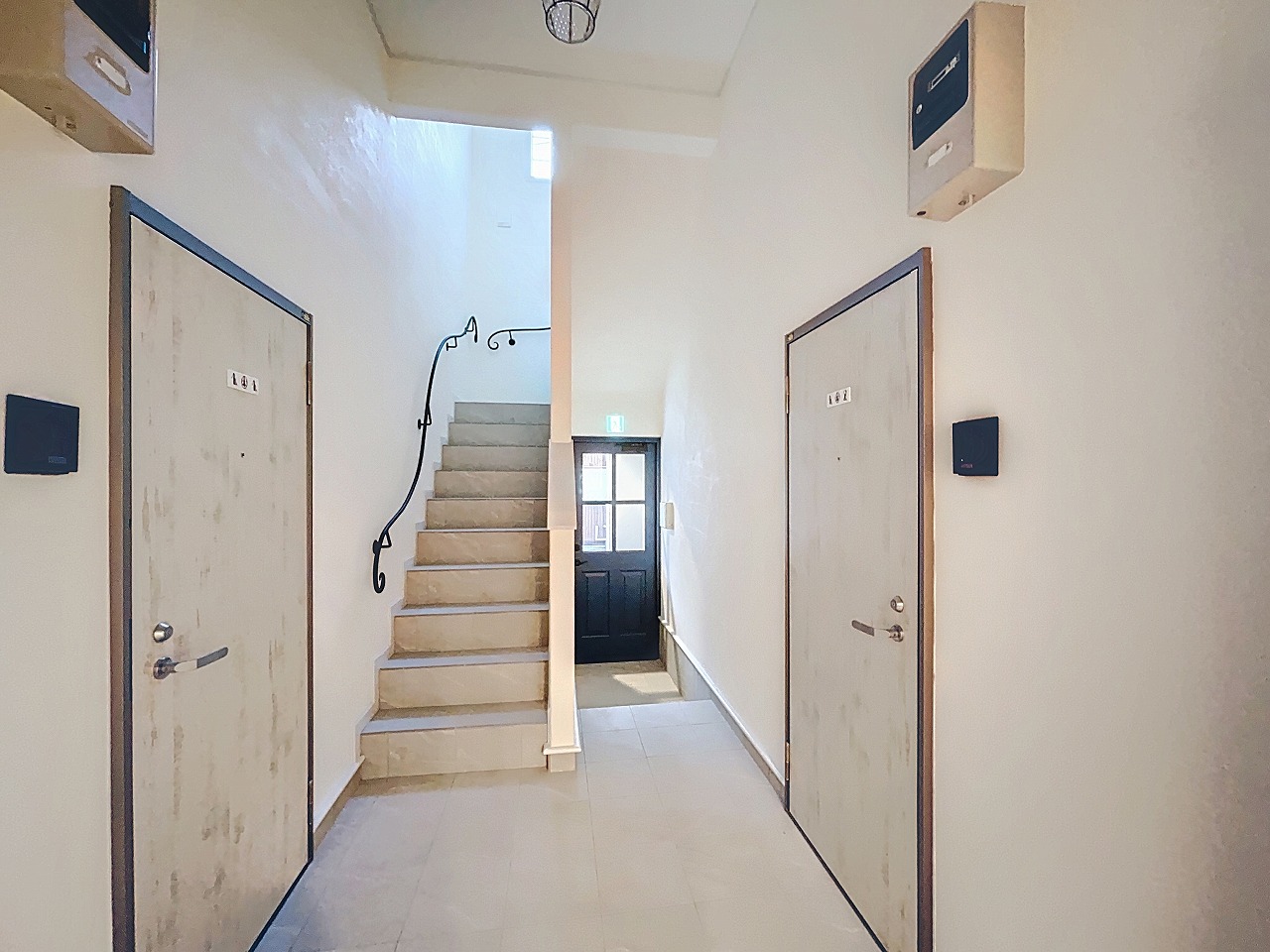 都市ガス・本下水・オートロック・宅配ボックス・敷地内ゴミ置場・駐輪場・下駄箱・バストイレ別・ウォシュレット・室内洗濯置場・独立洗面台・浴室乾燥機・室内物干・システムキッチン(2口IHコンロ)・収納付階段・モニターインターホン・照明器具
